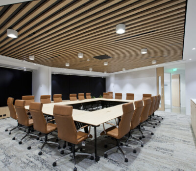 The new Energy Super office at the Riverside Centre has been created as a warm and welcoming tenancy fitout with the full functionality of a modern workspace. Providing the latest technology, full integration of telecommunications, audio-visual, lighting and mechanical services was an important part of the brief. At the same time these services were designed to provide a user friendly and simple interface that is consistent throughout the various meeting rooms, project rooms and multifunctional areas. Breakout and training rooms were constructed with operable walls to create flexible individual areas or a single, all-staff meeting space. At the same time all front of house services have been designed to complement high end architectural floor, wall and ceiling finishes.