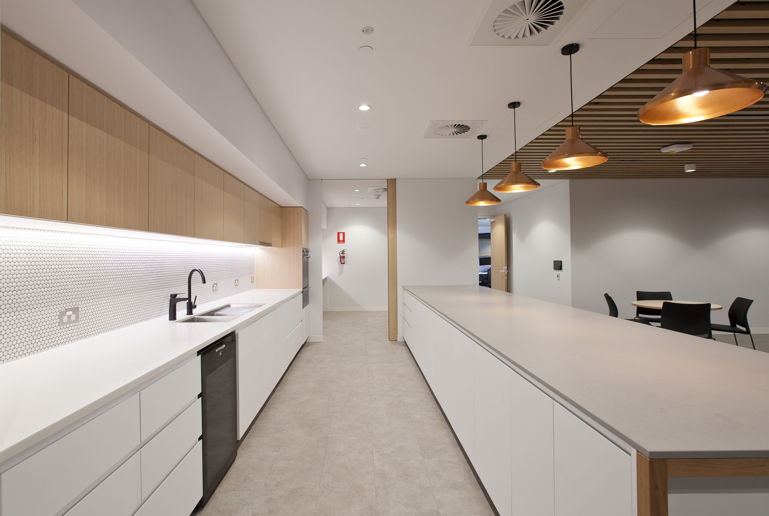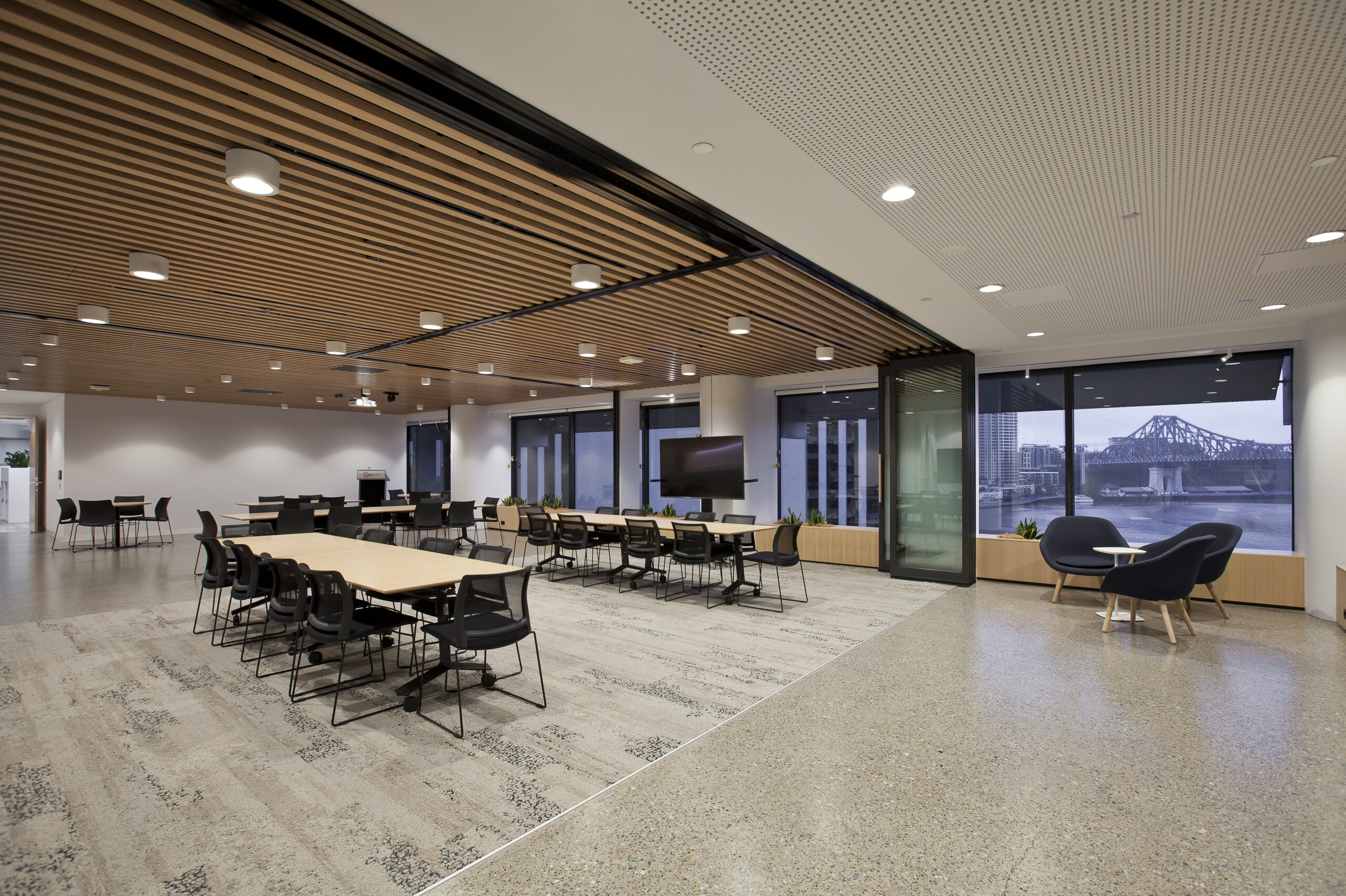 The new Energy Super office at the Riverside Centre has been created as a warm and welcoming tenancy fitout with the full functionality of a modern workspace. Providing the latest technology, full integration of telecommunications, audio-visual, lighting and mechanical services was an important part of the brief. At the same time these services were designed to provide a user friendly and simple interface that is consistent throughout the various meeting rooms, project rooms and multifunctional areas. Breakout and training rooms were constructed with operable walls to create flexible individual areas or a single, all-staff meeting space. At the same time all front of house services have been designed to complement high end architectural floor, wall and ceiling finishes.