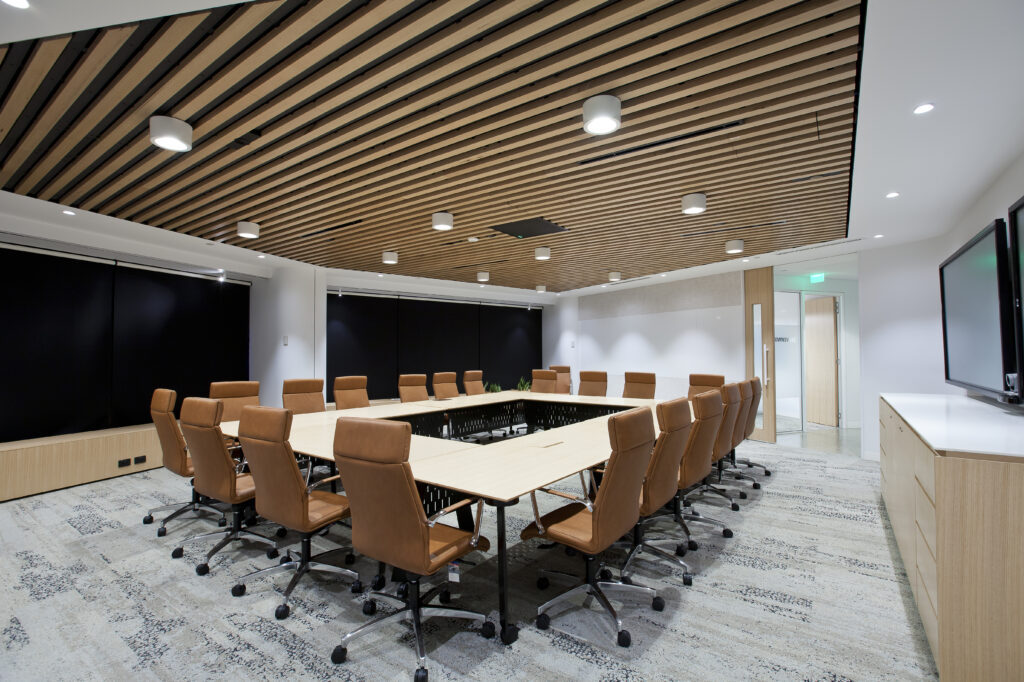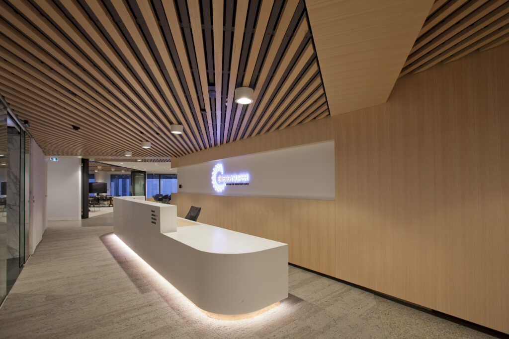 The new Energy Super office at the Riverside Centre has been created as a warm and welcoming tenancy fitout with the full functionality of a modern workspace. Providing the latest technology, full integration of telecommunications, audio-visual, lighting and mechanical services was an important part of the brief. At the same time these services were designed to provide a user friendly and simple interface that is consistent throughout the various meeting rooms, project rooms and multifunctional areas. Breakout and training rooms were constructed with operable walls to create flexible individual areas or a single, all-staff meeting space. At the same time all front of house services have been designed to complement high end architectural floor, wall and ceiling finishes.