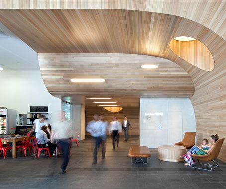 The timber element was designed to respond to the challenging existing building constraints. Its form transforms through the space to conceal a low-height service corridor in the ceiling void above the timber where mechanical plant is located. “Skylights” in the timber ceiling are achieved using Barrisol lighting to blend in with the natural feel to the foyer. Custom built cylindrical lighting was incorporated to enhance the circular elements of the skylights and fit in with the changing heights of the ceilings. Linear lighting features were selected to match the width of the timber and blend in with the lines of the ceiling.